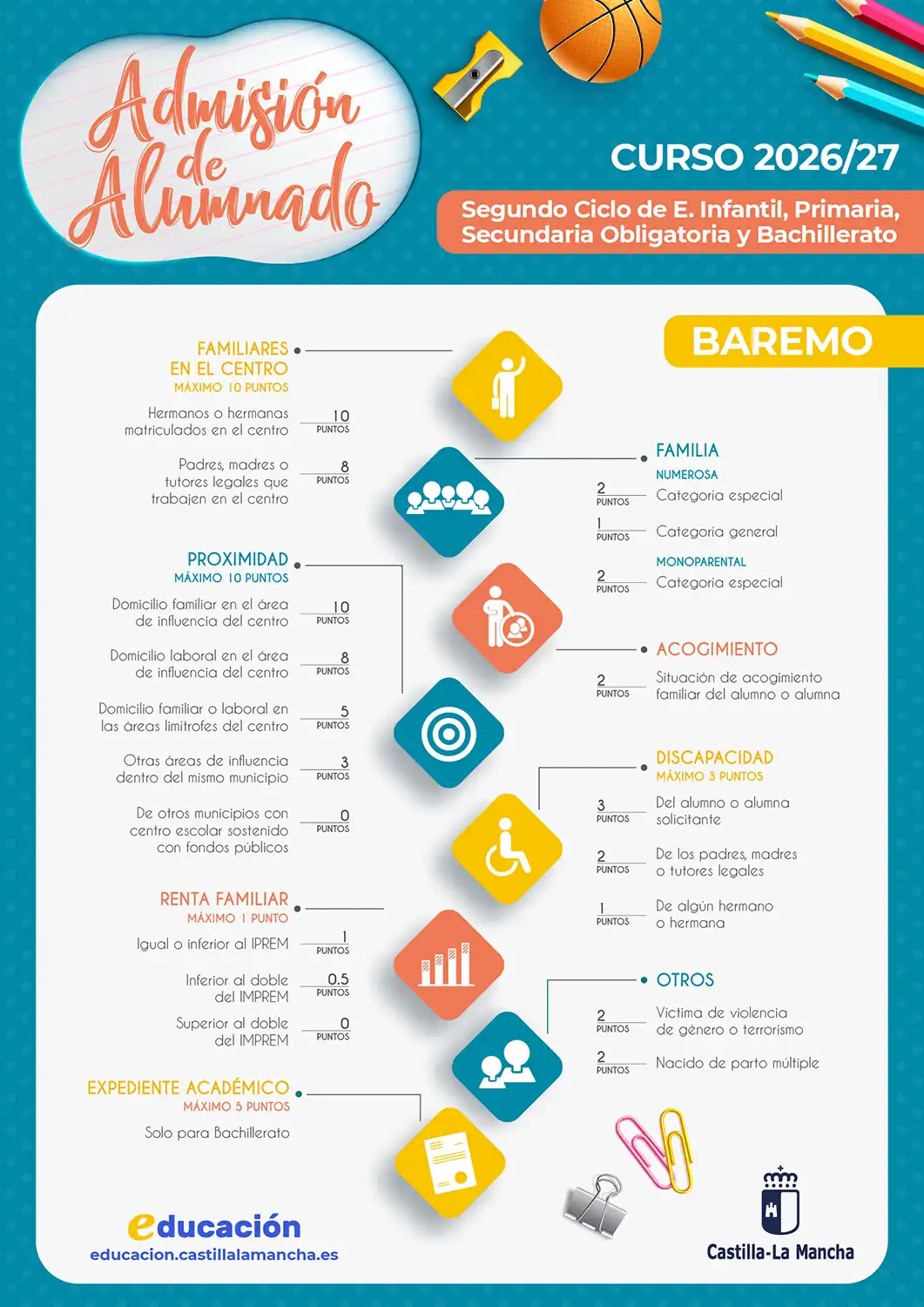 La Consejería de Educación, Cultura y Deportes de la Junta de Comunidades de Castilla-La Mancha convoca, anualmente, el proceso de admisión de alumnado en centros docentes públicos y privados concertados de ámbito no universitario. Tienen que participar en este proceso todos los alumnos y alumnas que se incorporen por primera vez al sistema educativo en un centro docente de la Región (público o concertado), que vayan a iniciar una nueva etapa de estudios en un centro distinto al actual, o bien, que deseen cambiar de centro.